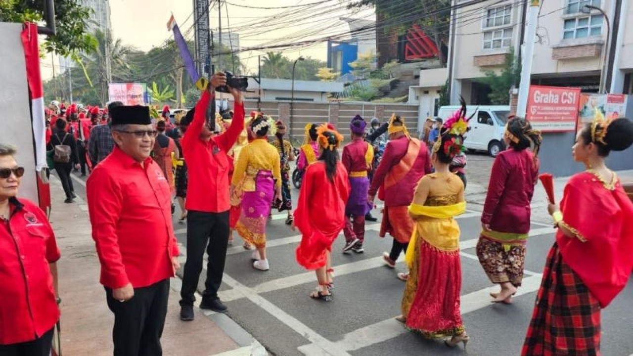 Sahabat.com - DPP PDI Perjuangan (PDIP) menggelar kirab 17 Agustus sebelum memulai upacara penaikan bendera merah putih dalam rangkaian memperingati Hari Ulang Tahun (HUT) Ke-78 RI, di Sekolah Partai DPP PDIP, Jakarta, Kamis.
