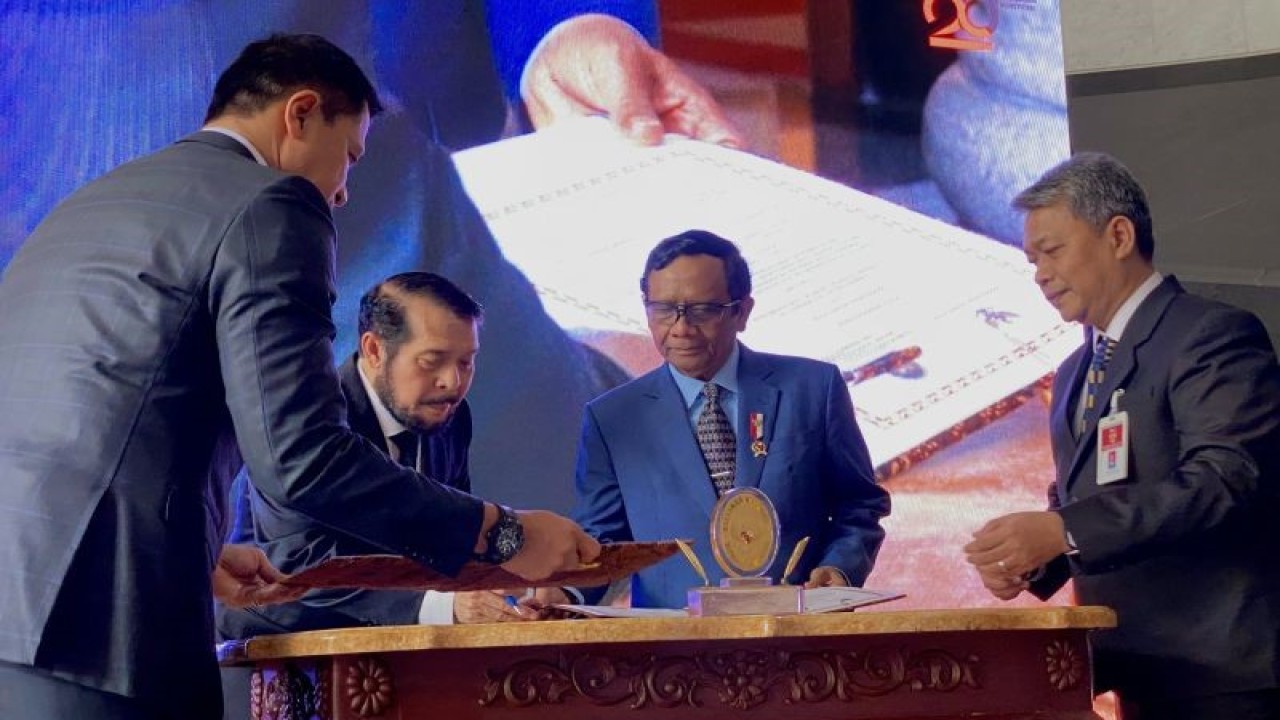 Penandatanganan Nota Kesepahaman dilakukan oleh Sekretaris Jenderal MK Heru Setiawan dan Sekretaris Kemenko Polhukam Teguh Pudjo Rumekso, disaksikan langsung oleh Ketua MK Anwar Usman dan Menko Polhukam Mahfud MD.